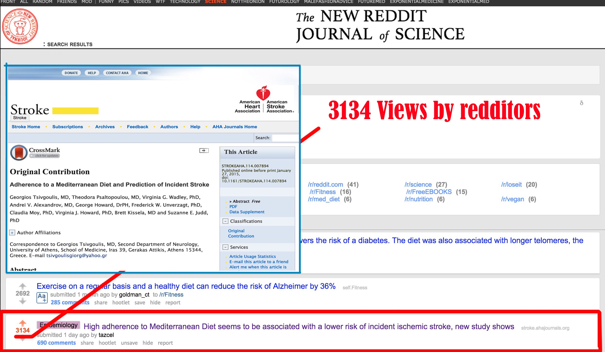 My point? Well my point is that Social Media does affect number of views and even though I congratulate the authors efforts I do not necessarily agree with them . Below you have an example of an article I was following in http://reddit.com/r/science. In the morning and then 6 hours later. It was coincidentally an article AHAJournals “Adherence to a Mediterranean Diet and Prediction of Incident Stroke”